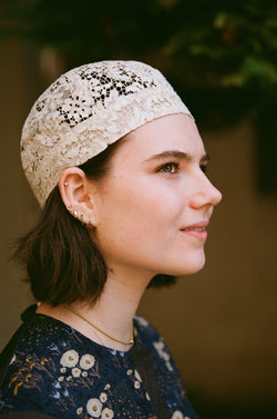 The Mühlbauer model Orly is a bonnet made of French lace, an eye-catcher on festive occasions, but also practical if you want to gather your hair. As it sits above the ears, it is summery and airy.